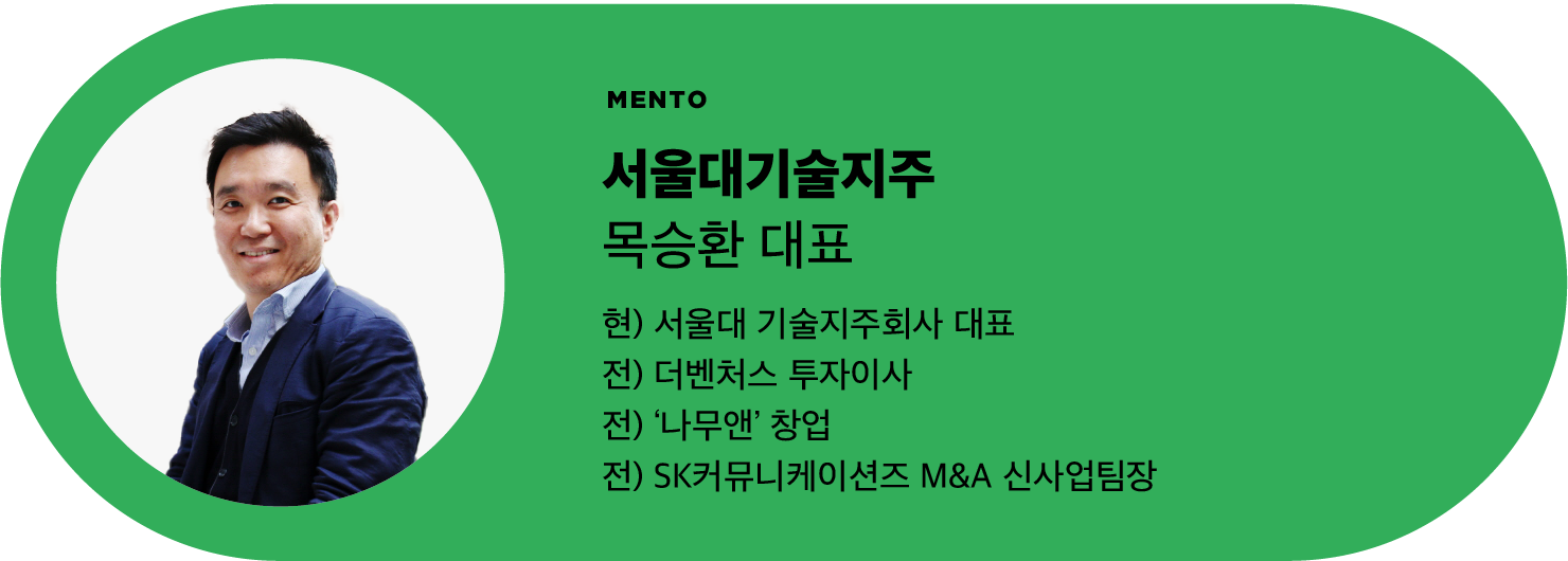 목승환 멘토님은 2009년 모바일 애플리케이션 개발 스타트업 ‘나무앤’을 창업하여 100종 이상의 앱을 개발, 서비스한 뒤  ‘더벤처스’에 매각한 경험이 있고 이후 더벤처스 투자이사를 역임하였습니다. 2016년부터 서울대기술지주회사에서 민간 펀드 조성을 통해 사업 영역을 확장하고 다양한 분야의 100여개 초기스타트업 발굴과 투자를 집행했습니다.